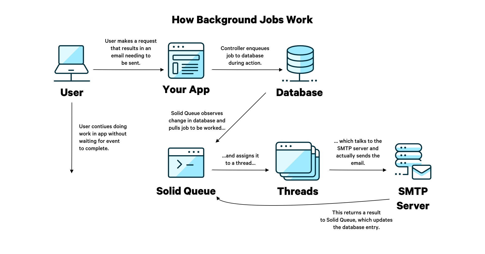 当使用 Action Mailer 的 deliver_later 发送电子邮件时,这些电子邮件将被发送到 Active Job 进行后台发送,这样它们就不会延迟 HTTP 请求。在生产环境中,使用 Solid Queue,电子邮件将在后台发送,如果发送失败会自动重试,并且在重启期间作业会安全地保存在数据库中。